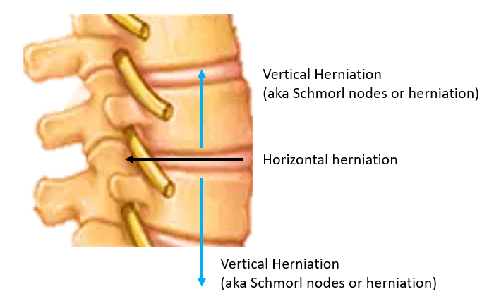 “Schmorl’s nodes are herniations of nucleus pulposus through the cartilaginous and bony endplate into the adjacent vertebra…In postmortem studies, it has been estimated that greater than 70% of the population has Schmorl’s nodes.”[1,2]
